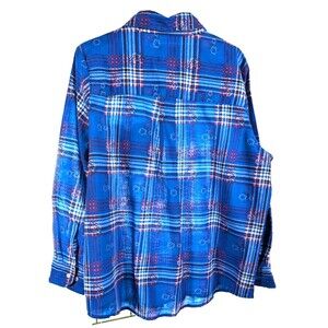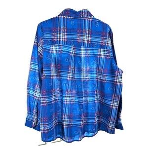 This American Sweetheart women's flannel shirt is perfect for both casual and travel occasions. The shirt features a collared neckline and button closure, with a colorful plaid pattern and accents. The long sleeves and casual sleeve type make it a perfect choice for Fall, Winter, and Spring seasons. The shirt is made of a blend of polyester and cotton and is machine washable for easy care. It also includes pockets for convenience. This preowned shirt is perfect for those who love classic and colorful themes and cowgirl-inspired fashion. It comes in XL size and fits in a classic style. The shirt is a unit type and includes one piece. The brand is American and it is made in Pakistan. This shirt is perfect for women who love to look stylish and comfortable at the same time.