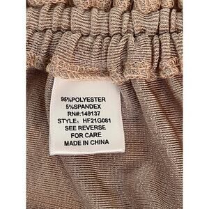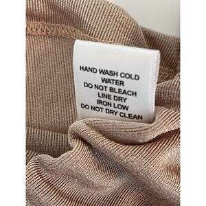 This American Threads top is a dressy camisole in size M/L featuring a cowl neck and shimmering beige Spandex material. It has spaghetti straps with an adjustable design, creating a stylish look. The brand is American Threads, and the fit is regular. This top is perfect for a chic and elegant outfit.