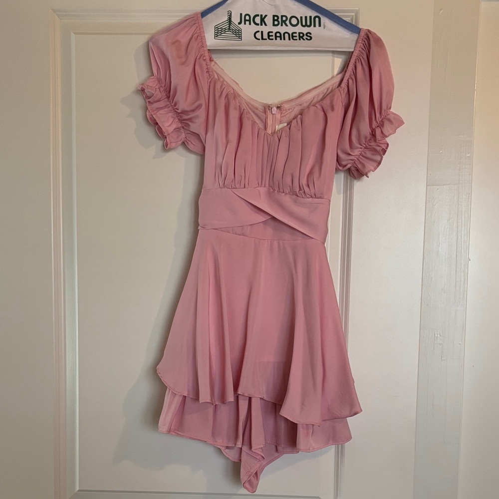 Charming pink romper with ruffled sleeves and layered skirt. Perfect for a stylish look.