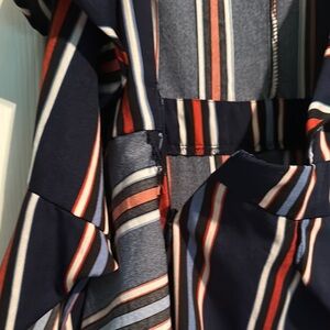 Stylish wrap romper with ruffle details. Features a striking striped pattern in navy, red, and white.