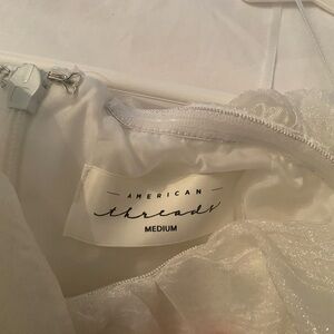 Stylish white dress featuring elegant ruffles. Ideal for special events. Slip lining.