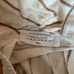 Chic wrap top with brown stripes. Short sleeves. Lightweight fabric.