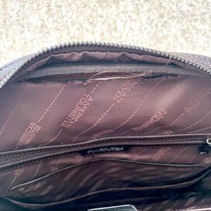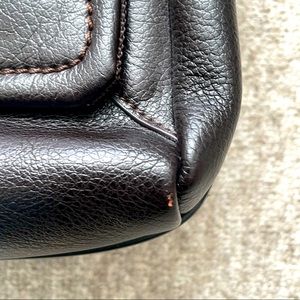Gently used, dark brown leather backpack. There is minor wear on the outside and a small tear in the seam inside the backpack. The straps are adjustable, and the laptop compartment easily holds a 13โ MacBook Air.