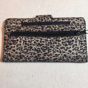 American Tourister checkbook wallet. Leopard print, snap closure. Vertical or horizontal slots for checkbook. 2 long bill folds, clear ID pocket, with 4 credit card pockets and Pen holder. Outside back has zipper pocket and long bill pocket with attached clear ID sleeve. There is stains (which may or may not come off) on snap fold and on the fold. And corner of zipper pocket shoes wear. Please see pictures.