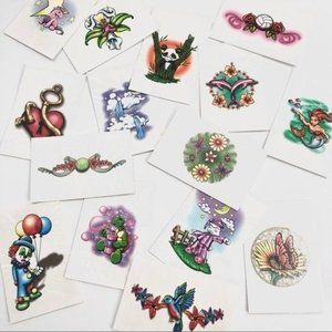 These cute tattoos are deadstock from those old vending machines (back when you could buy something for a quarter!). These tattoos feature a cartoon American traditional style and feature all sorts of designs, including pandas, clowns, sports, moons, stars, and flowers. Super rare find, authentic Y2K 2000's limited edition temporary tattoos.
