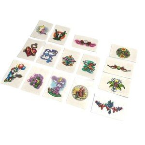 These cute tattoos are deadstock from those old vending machines (back when you could buy something for a quarter!). These tattoos feature a cartoon American traditional style and feature all sorts of designs, including pandas, clowns, sports, moons, stars, and flowers. Super rare find, authentic Y2K 2000's limited edition temporary tattoos.