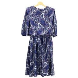 American VINTAGE 80s Size 16 Petite Blue Paisley Pleated 1/2 Length Sleeve Dress