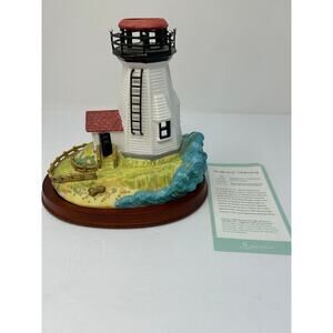 In good vintage condition this is the first in the lighthouse series from Party Lite 2003. It is a replica of the Plymouth lighthouse established in 1769 in Massachusetts. Has the original Certificate of Authenticity. This is a Party Lite exclusive and is the first in a collectable series. The wood base has a few tiny areas where the stain is worn off. This is a tea light holder and looks beautiful with a tealight candle inside.