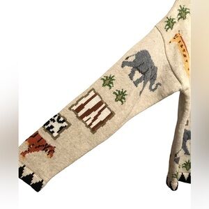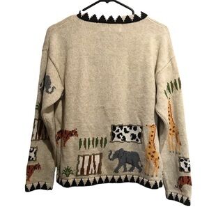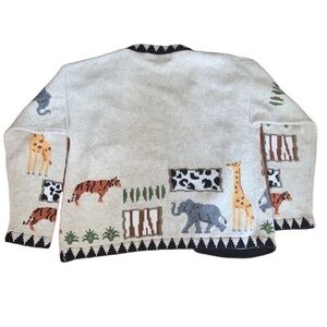 Charming cardigan with animal motifs. Features elephants, giraffes, and tigers. Button-up front. Cozy and stylish.