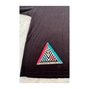Authentic vintage Cherokee Health Fitness T-shirt, made in the USA from 100% cotton. Features a bold retro geometric triangle graphic in teal, red, black, and white with “Health Fitness Cherokee” text. Classic crewneck short sleeve with a slightly boxy fit, labeled One Size Fits All. True vintage piece, perfect for 80s/90s streetwear lovers, collectors, or casual everyday wear. Soft, breathable cotton with a worn-in vintage feel. A great addition to any retro wardrobe.