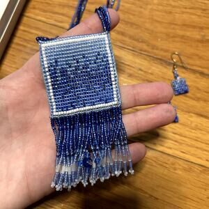 American Vintage Hand Beaded Necklace and Earrings Set Blue Ombre