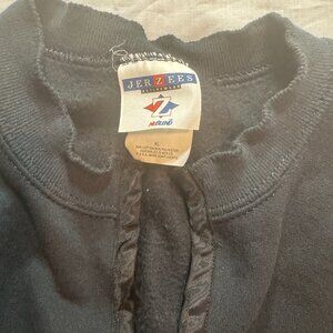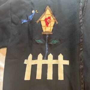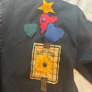 Jerzees black sweatshirt with applique picket fence, bird, sunflower garden stake, and hearts. Sweatshirt is open down the middle and finished in black ribbon trim.