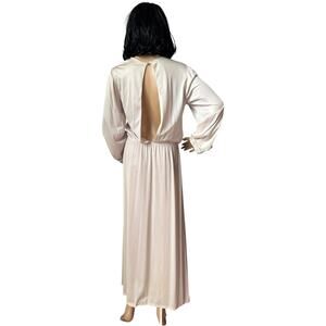 featuring a long sleeved nightgown with round neck and big open back with one button tie at the neck. Elastic waistband with a tie, colored ribbon accent down the center and shoulders.