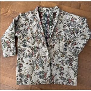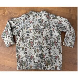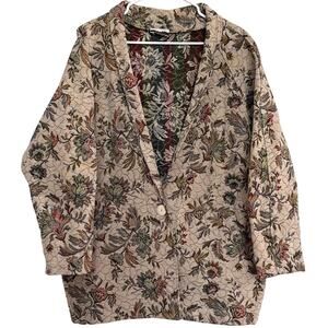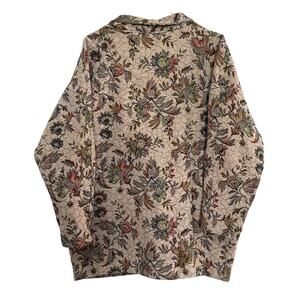 American vintage Beged New York brand jacket with a beige and brown floral pattern. Made for 100% cotton and is on the heavier side and suitable for cooler weather. The style is reminiscent of the 1970s, with a relaxed fit and a simple one big cream button closure, Two side pockets and raglan sleeves. The print gives it a bohemian or retro vibe, making it a fashionable vintage piece, Cream with brown, green, tan and rust in color.