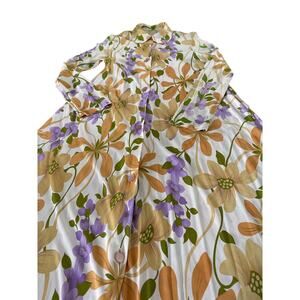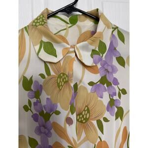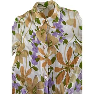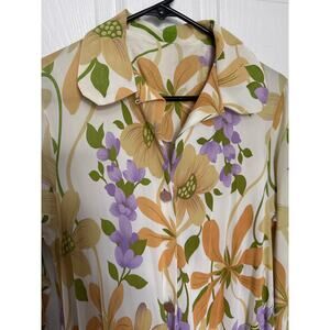 This unique piece, possibly a housecoat turned fashion statement, features a delightful floral pattern in orange, purple, and green hues against a light cream background. Its long sleeves, collared neckline, and button-down front evoke a classic 1970s vibe.