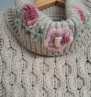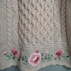 very good vintage condition, shoulder pads, tan cable knit pattern, embroidered flowers on turtleneck & bottom scalloped hem, measures pit to pit 22" sleeve 23" length 28" ramie/acrylic blend
