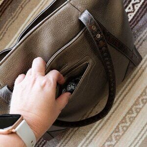 KEYWORDS: ANTIQUE BRASS FAUX LEATHER CONCEALED CONCEAL CARRY GUN TOTING WESTERN MAMA SOUTHWESTERN RANCH FARM RODEO EQUESTRIAN SOUTHERN METALLIC GROMMETS COLORBLOCK STOCK SHOW BOUTIQUE UNIQUE DESIGNER GENUINE FULL GRAIN PEBBLED SMOOTH STUDS SHIMMER WARM NEUTRAL BROWN GOLDEN RUSTIC STOCKYARDS NFR TRAVEL LUGGAGE LAPTOP BUSINESS SHOPPER SHOPPING OVERNIGHT BAG SATCHEL PURSE BOHEMIAN BOHO WITH AN EDGE COWGIRL COWBOY CHIC LIMITED EDITION SHOULDER BAG FRINGE CHARMS FLORAL BOTANIC LEAVES EMBOSSED