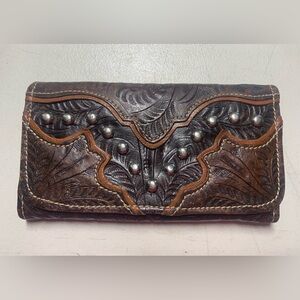 American West Genuine Leather Wallet. Two tone brown leather. Tooled leather with silver tone metal studs. Snap closure. In great condition.