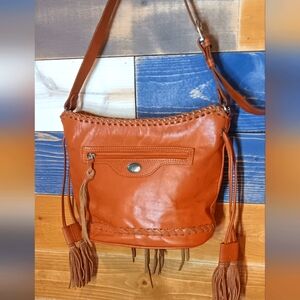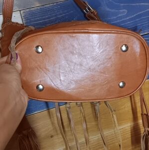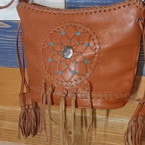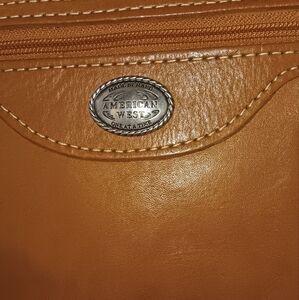 American West handmade handbag. This bag is stunning and in beautiful condition. Silver tooled hardware and decoration. Braided leather along the top and bottom with fringe details. The strap is adjustable. One large compartment inside with a zipper pocket and two additional open pockets.