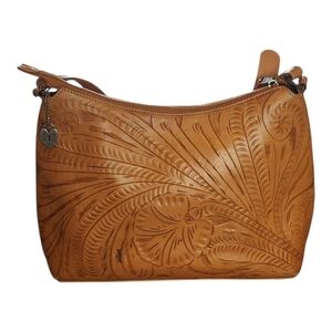 Add a bold Western flair to your accessories collection with this American West Genuine Leather Tooled Shoulder Bag. Crafted from rich caramel-toned genuine leather, this beautifully structured handbag features intricate hand-tooled floral and basketweave embossing, accented with silver-tone stud detailing and an ornate Western buckle centerpiece. The etched hardware and heart-shaped logo charm complete the signature Southwestern look.