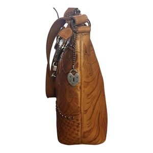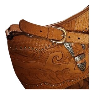 American West Tooled Leather Western Shoulder Bag Studded Buckle Charm