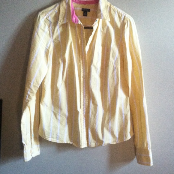 Light yellow, with pink & white stripe. Very soft. Good condition. Has blue button on top & sleeves.