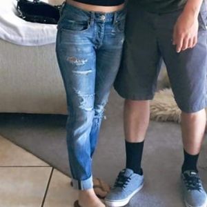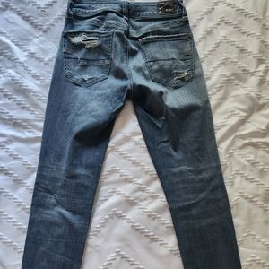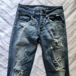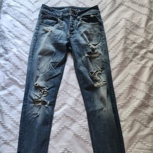 Distressed jeans are super, super stretch size 00 but can fit a 2. They are super comfy and look very nice on.