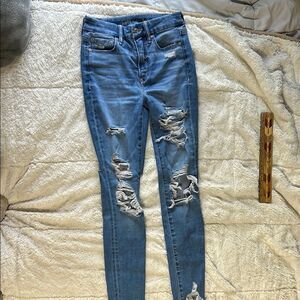 Stylish distressed jeans in a classic blue shade. Perfect for a casual, trendy look. Has rips in front and back size 4 ultimate stretch and high waisted inseam 26”