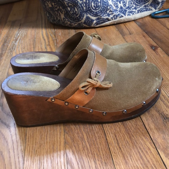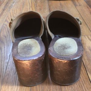 Real wood & leather tan clogs, some moderate wear, bottoms still like new, small crack in wood on right clog, just visible doesn’t effect the wearing of them, still all intact.
