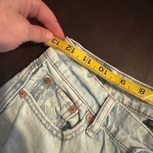 Highest rise baggy straight with asymmetrical button. Good, gently worn condition. 0 long.