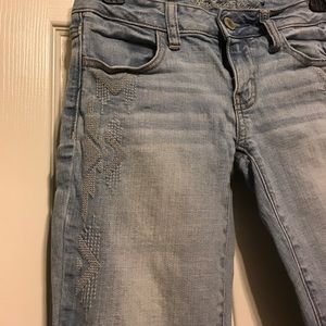 Size 0 regular/standard American eagle jeggings. Super stretch. Designs along the hips (second photo) but don't run all the way down the leg.