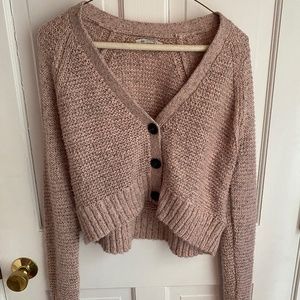 Light pink sweater with a low neck and three buttons. Pretty cropped too, def really cute with high waisted jeans or leggings!