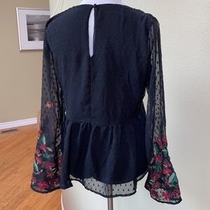Great condition. Beautiful embroidery on Swiss dot black chiffon material with liner. Keyhole back. SZ S. Measurements are approximate laying flat in pictures.