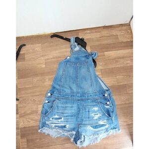 Pre-owned denim overalls by American eagle. Short shorts with distressing. Large front pocket and side pockets. Traditional buttons and straps. One strap is a little wonky -a bit twisted, but it does work fine both straps are adjustable