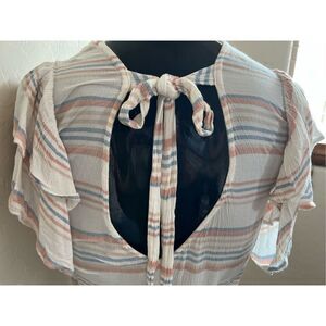 American eagle outfitters romper size M gently used sumner wear, summer romper. it has 5 inc ruffle sleeve, open back and cross cleavage. Measurements are taken across the front. Pit to pit 17, Bust 34, Waist 13 elastic, Hips 20, Length 31, Sleeves 5. Summer, Spring, Nautical, Light academia ,Sophisticated, Classy, Polished, Preppy, Tailored, Flowy.