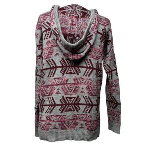 hooded sweater, geometric print, cozy knit, casual sweatshirt, printed pullover, long sleeve, winter wear, patterned fleece, relaxed fit, layered look