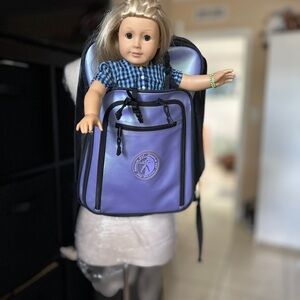 American girl carrier, Gray and Black Backpack with Purple Logo