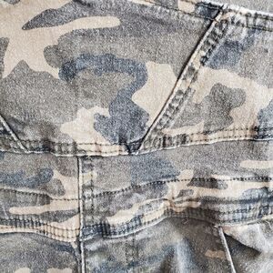 Stretchy camouflage camo print denim overalls with super distressed thighs. Skinny fit. Adjustable straps.