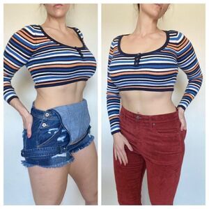 American Eagle Baby Tee Cropped Shirt NEW Ribbed Stretchy XS American Eagle long sleeve crop top baby tee—Hello 90s vibe! NEW {without tags} but the extra button ziplock is attached to the material tag: only worn to model for photos. Size XS: Ribbed construction gives this beauty natural stretch. Please see photo section for approximate flat measurements + my model stats. Material: 55% cotton, 20% polyester, 15% acrylic, 10% viscose. American Eagle 90s Vibe Baby Tee Crop Top Ribbed Stripes