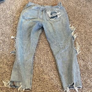 AE “mom jean” offer a contemporary look with their distressed detailing and medium wash. The jeans feature a full-length design with strategic tears and fraying for a casual, lived-in appearance. 24 inch inseam, size 4(short) with loose ankle fit