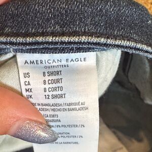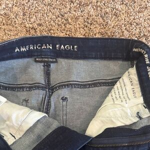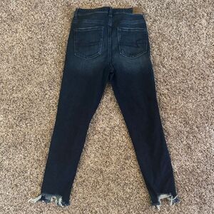 AE “next level stretch ” highest rise jegging skinny jeans offer a contemporary look with their distressed detailing and dark wash. The jeans feature a full-length design with strategic tears and fraying for a casual, lived-in appearance. 25 inch inseam, size 8 (short) with skinny ankle fit