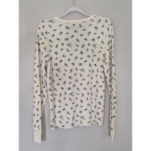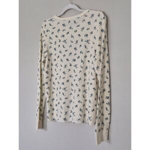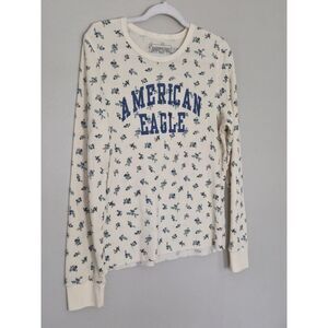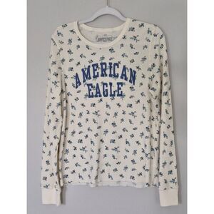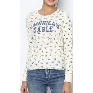 Keywords: American Eagle, floral print, long sleeve, thermal top, waffle knit, crew neck, casual top, cream top, blue floral, fitted top, layering top, women's top, spring top, fall top