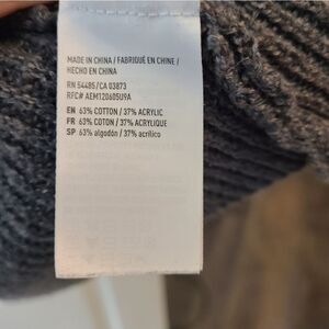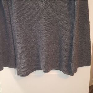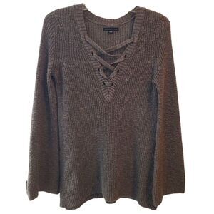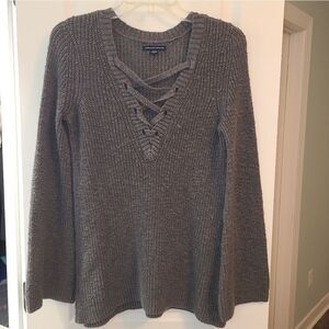 American Eagle Gray Bell Sleeve V-Neck Ribbed Sweater in a size small. Neckline has a deep v with a threaded criss cross design. Made of a cotton/acrylic blend. Excellent Condition.