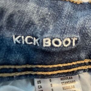 American Eagle Outfitters Y2K 360 Super Stretch Kickboot Jeans in Blue Medium Wash Denim. They are a Low-Rise, Super Stretchy, never-loses-its-shape denim, that Won't bag out. Classic 5 Pocket Styling, a Straight Leg and a Bootcut Flare ankle.