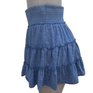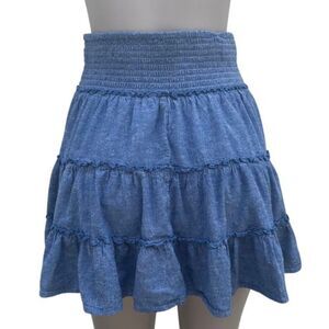 American Eagle Outfitters Mini Skirt Women's Medium Blue Chambray Linen Blend Smocked Ruffle Tiered