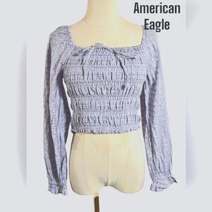 This super cute American Eagle long-sleeve top has a chill, light purple vibe with little white flowers all over, giving off some spring feels. The top part is smocked and stretchy and it's got this sweet little tie in the middle. The sleeves are long with a bit of a ruffle at the end, which is a nice touch. It's definitely a crop top, so it'll look fire with some high-waisted jeans or shorts. It's that perfect top you can just throw on and look effortlessly put-together.