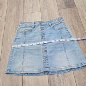 Step up your wardrobe game with this American Eagle Outfitters High Rise Light Blue Wash Stretch Jean Mini Skirt! This stylish mini features a flattering high-rise fit and a fun button-down front, making it a must-have for sunny days. The light blue wash gives it that effortless, laid-back vibe, perfect for pairing with everything from graphic tees to cozy sweaters. Get ready to turn heads! Make an offer!