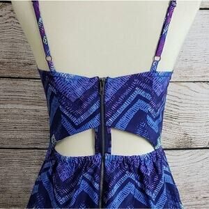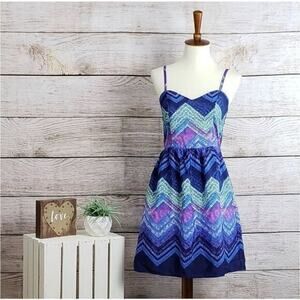 Cute and vibrant American Eagle zig zag pattern dress. Shades of blue, purple, and green make this the perfect dress for summer. Cute cut out back. Lightweight and 100% Polyester. Size 0.
