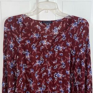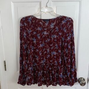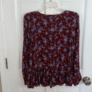 American Eagle Outfitters long sleeve gauze blouse in burgundy with blue and white floral print, cutout at neckline, and ruffled hem. In excellent condition!