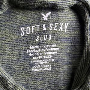 Stay stylish and comfortable in this American Eagle “Soft & Sexy Slub” long sleeve top, size XS. Featuring an olive green micro-stripe pattern, a mock neck, and a flattering teardrop keyhole cutout in front. Made from a stretchy and ultra-soft viscose blend for a relaxed, breathable fit perfect for layering or wearing solo. A casual-chic staple for your wardrobe.